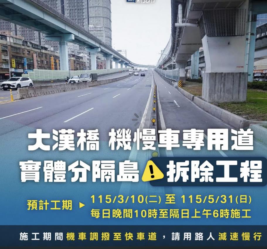 2026-03-05 大漢橋夜間施工公告:機車道實體分隔島明日(3/10)起拆除 溫馨提醒: 大漢橋夜間施工公告:機車道實體分隔島明日(3/10)起拆除 新北市府為優化大漢橋機車行駛空間並改善車流,將進行機慢車道實體分隔島拆除工程 為降低交通衝擊,全面採「夜間施工」 施工時間將進行交管 白天則恢復正常通行,請用路人留意 【施工與交管資訊】 預計工期:115/3/10(二)至115/5/31(日) 交管時段:每日夜間22:00至翌日6:00(遇雨順延) 【動線改道提醒】 夜間施工期間將縮減汽車道,機車騎士請配合現場告示牌面與交維人員導引,改道行駛「快車道」。行經工區請務必減速慢行,確保行車安全。 【分階段拆除期程】 第一階段(板橋往新莊):預計4/30(四)前完成 第二階段(新莊往板橋):預計5/31(日)前完成 回上一頁