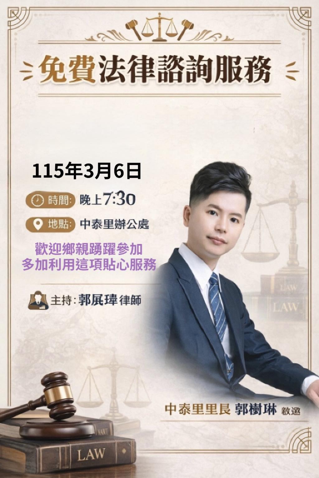 115/3/6免費法律諮詢,請鄉親多加利用。