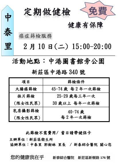 2026-02-07 新莊區中泰里免費癌症篩檢 活動 這是一項為了推廣「早期#發現、早期治療」而舉辦的社區健檢服務,現場不需費用,請符合資格的朋友把握機會。 活動時間與地點 • 日期: 2 月 10 日(星期二) • 時間: 15:00 – 20:00 • 地點: 中港圖書館旁公園(新莊區中港路 340 號) #定期做檢查 #健康有保障 #您的健康我在乎 #中泰里里長郭樹琳 回上一頁