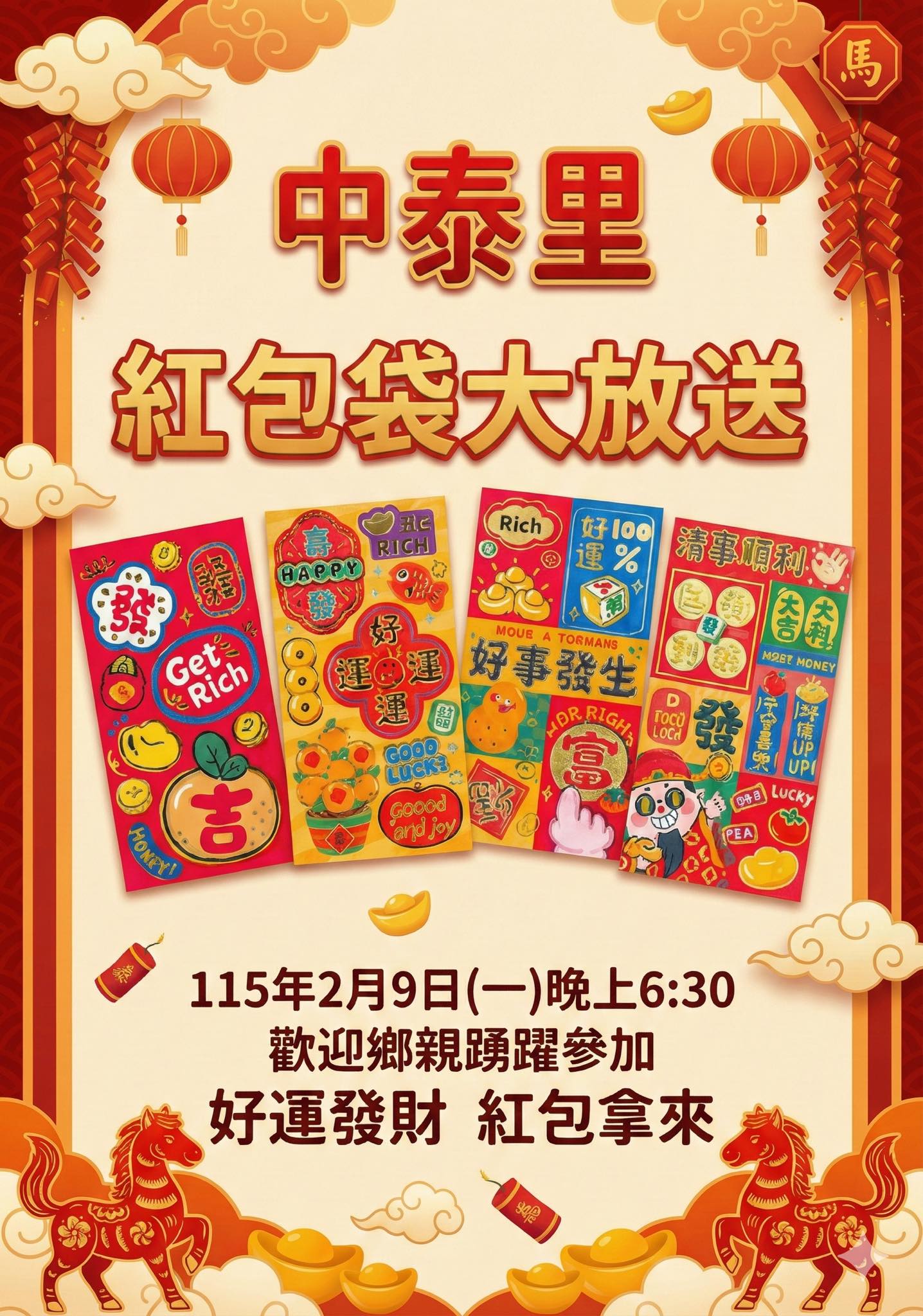 2026-02-02 中泰里紅包袋大放送 ???? 祝大家馬年奔騰! 【 各位中泰里的鄉親父老兄弟姊妹大家好! 為了迎接喜氣洋洋的馬年,里辦公處特別準備了精美的 「限量紅包袋」 要送給大家,讓大家新的一年財源廣進、好運馬不停蹄! • 活動時間: 115年 2月 9日(ㄧ)晚上 6:30~8:30歡迎全體鄉親踴躍參加,每人限一份(6個)送完為止喔! 祝大家:馬到成功、萬事如意、馬年行大運! 回上一頁