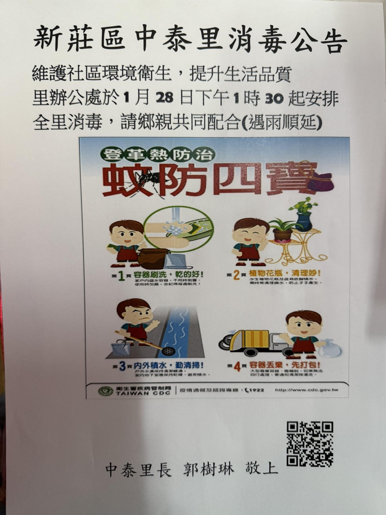 2026-01-21 中泰里全里大消毒 維護社區環境衛生,防治登革熱,中泰里1/28下午全里大消毒,讓鄉親過一個舒適乾淨的春節。 #中泰里 #登革熱防治 #社區消毒 #乾淨過好年 #環境衛生#巡倒清刷 回上一頁