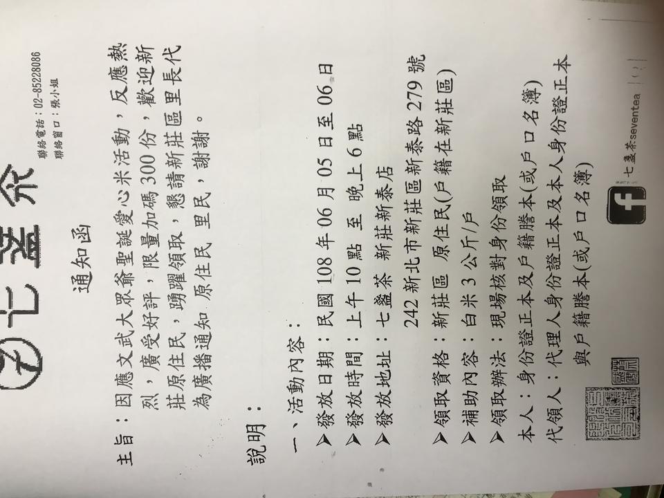 七盞茶贈原住民愛心米活動 請原住民鄉親踴躍領取。