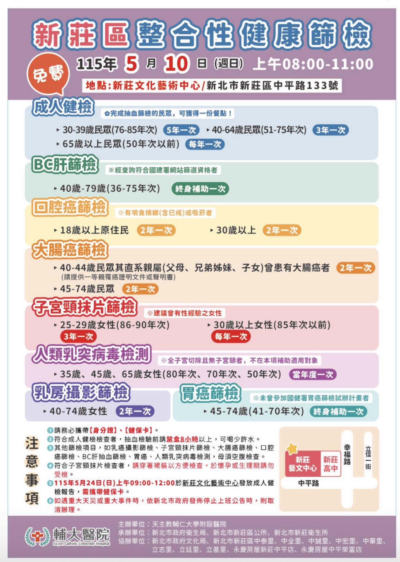 2026-04-29 免費整合性健康篩檢 免費整合性健康篩檢 115年5月10日(周日)上午08:00~11:30 地點:新莊文化藝術中心(新莊區中平路133號) #輔大醫院 #成人健檢 #BC肝篩檢 #口腔癌篩檢 #大腸癌篩檢 #子宮頸抹片篩檢 #人類乳突病毒檢測 #乳房攝影篩檢 #胃癌篩檢 回上一頁