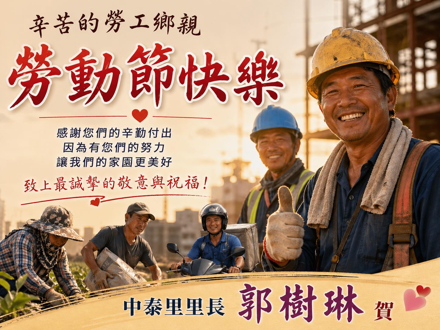 2026-04-30 祝賀全體勞工朋友,五一勞動節快樂! 在這充滿感恩的日子裡,向每一位默默耕耘、為生活打拼的勞工朋友致上最高的敬意。因為有您的辛勤汗水,才換來家庭的安穩與社會的進步。 #感恩付出 #衷心祝福 #平安順心 中泰里里長 郭樹琳 賀 回上一頁